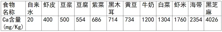 (5)周培聪《补钙从食物中来》:水与食物中钙含量的比较:水与食物中Ca含量(mg/Kg)