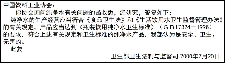 饮用纯净水是安全、卫生、无害,已经得到业界的一致公认,并有卫生部文件所认定。