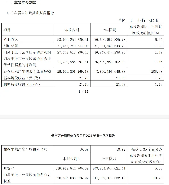 2026年第一季度,茅台实现营业收入与归母净利润双双创下单季度历史新高。营业收入为539.09亿元,同比增长6.54%;净利润为272.43亿元,同比增长1.47%。在行业调整期内,这一表现主要源于真实消费群体规模的持续扩大。