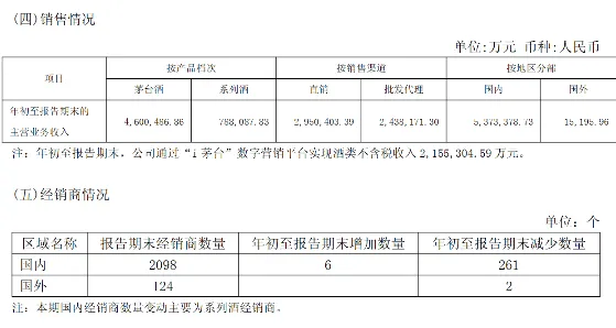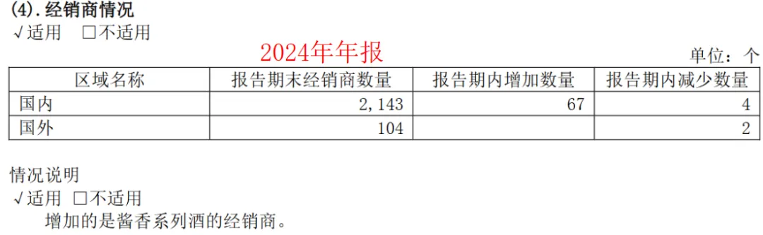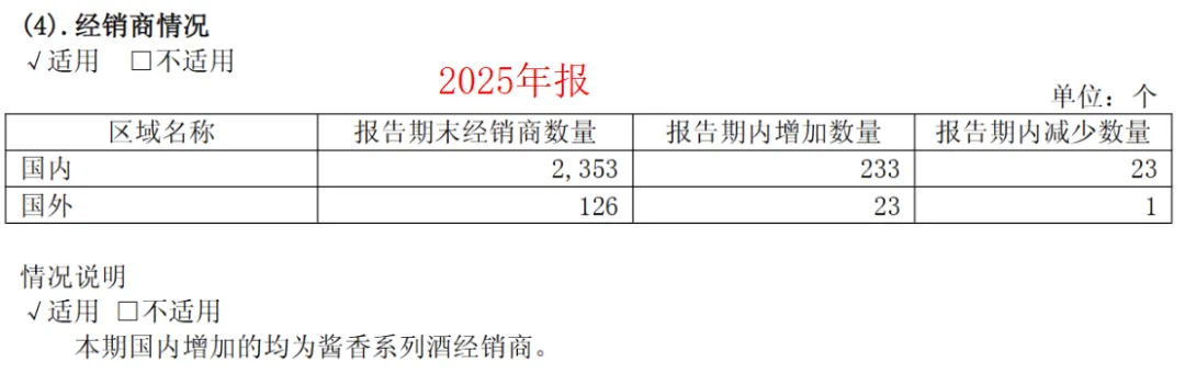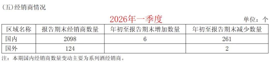 截至一季度末,国内经销商总数量为2098家,净减少255家(新增6家,减少261家),且变动主要集中于系列酒经销商。