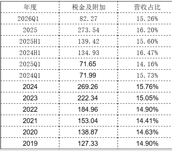 税金及附加一季度为82.27亿元,占营收比例为15.26%,较2025年全年水平降低近一个百分点,与历年同期相比属于正常波动范围。