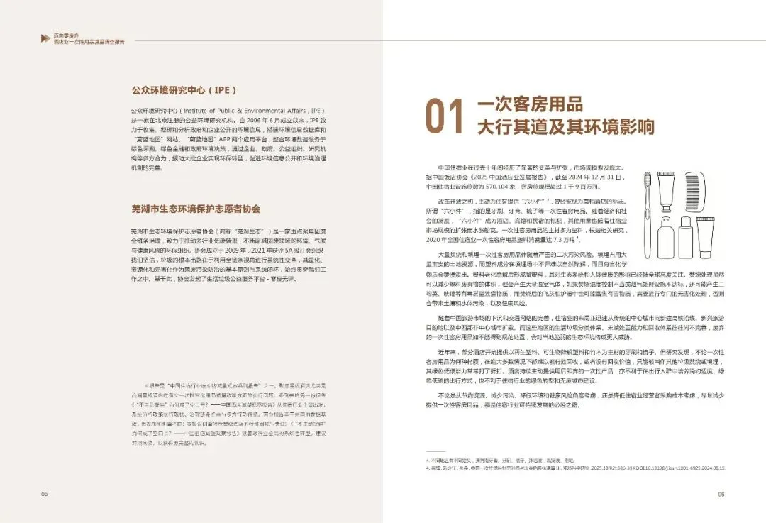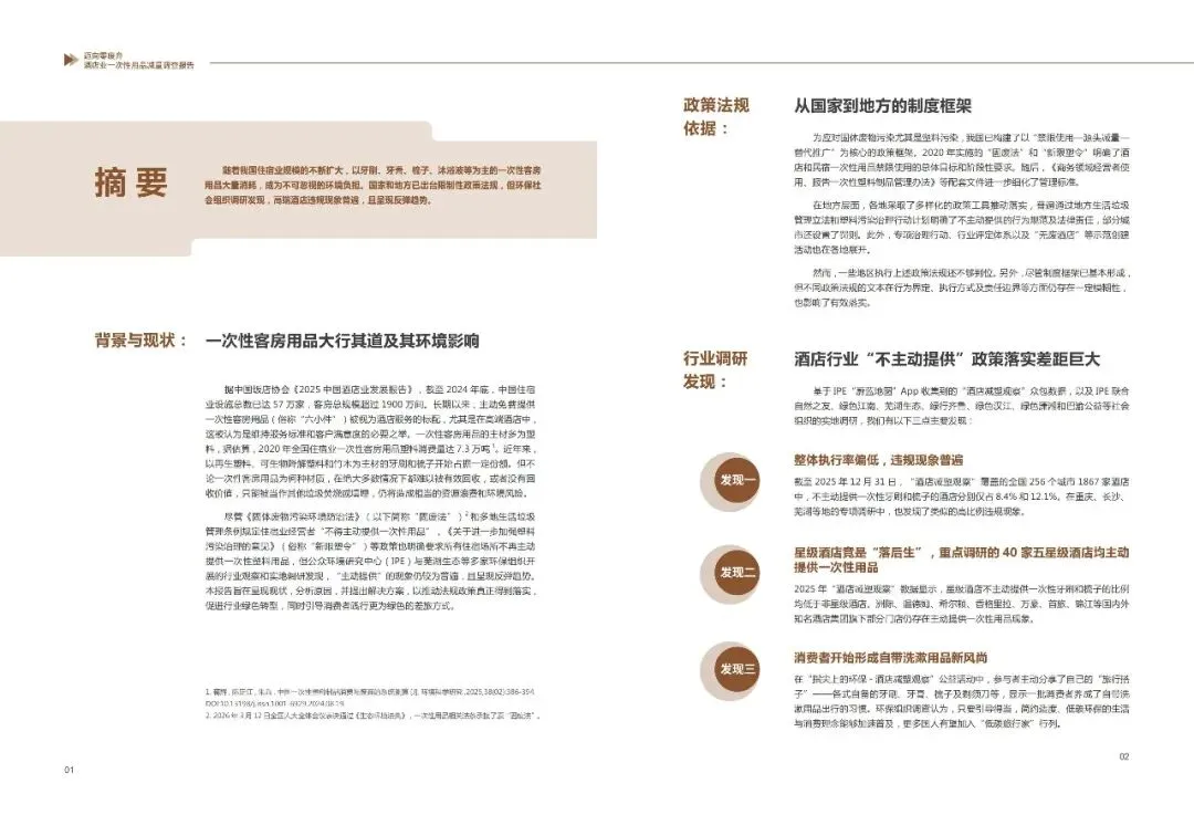 随着中国住宿业规模持续扩大,截至2024年底,全国住宿设施总数达57万家,客房超1900万间。以牙刷、牙膏、梳子等为代表的一次性客房用品大量消耗,主材多为塑料,2020年全国住宿业一次性客房用品塑料消费量约7.3万吨。这些用品难以有效回收,大多被焚烧或填埋,造成资源浪费和环境风险。