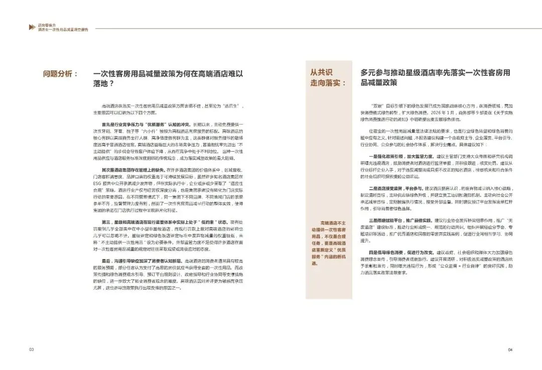 高端酒店难以落实减量政策的原因包括四个方面。一是行业竞争压力与“优质服务”认知的冲突,酒店普遍担心不主动提供会降低客户体验,陷入“囚徒困境”。二是酒店集团管理缺失,ESG承诺在门店执行中呈现碎片化,产权与经营权分离导致集团约束力不足。