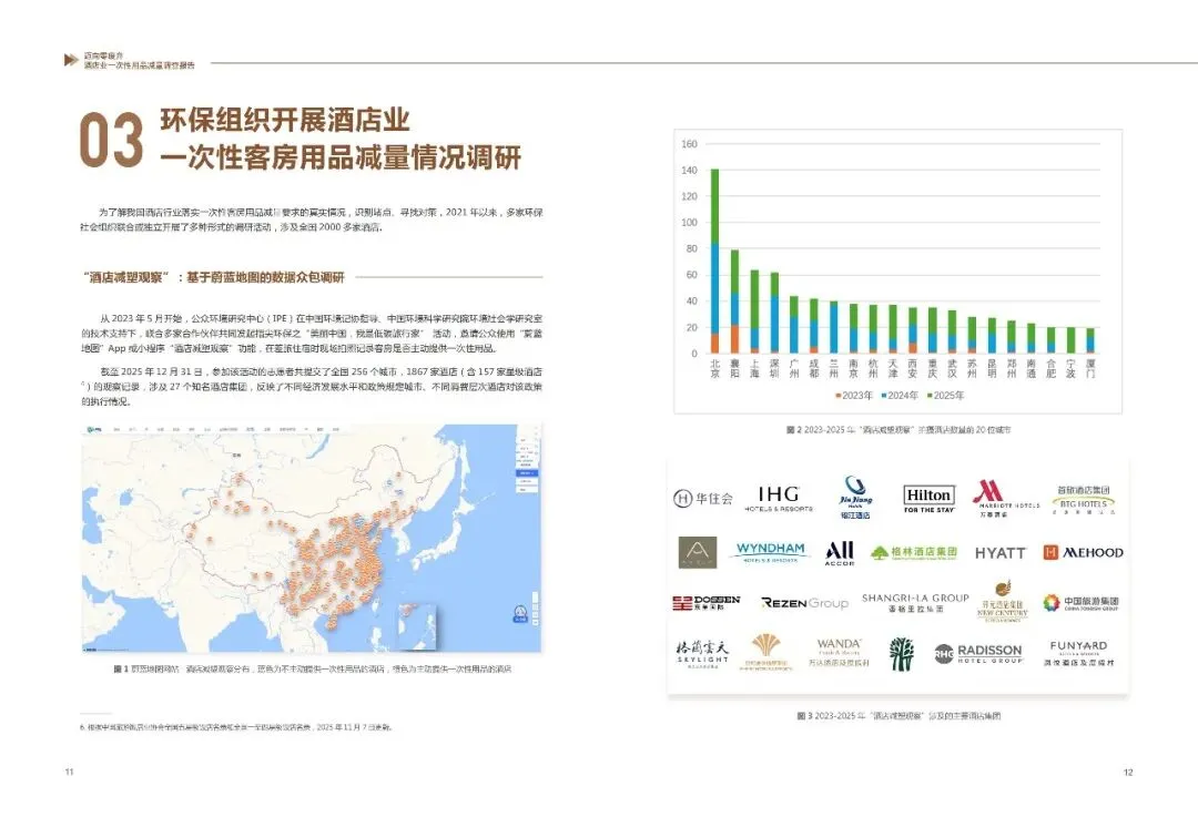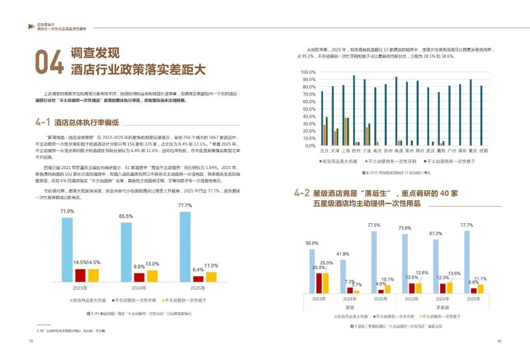 多家环保组织通过“蔚蓝地图”App众包数据和实地调研发现,政策落实情况整体不佳。截至2025年12月,覆盖全国256个城市1867家酒店的观察显示,不主动提供一次性牙刷和梳子的酒店仅占8.4%和12.1%。
