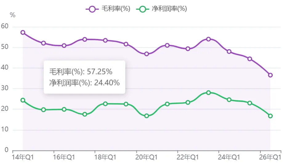 上面这一票图的结论就是,净利率持续走低要警惕,公司运行效率变高是好事儿。我们在看看历年一季度的情况,2026年一季度这个毛利率是掉的很可怕,历史上也就疫情的时候这么掉过。但是我还是认为一个季度的波动说明不了太大问题,大概率是生意的节奏造成的。
