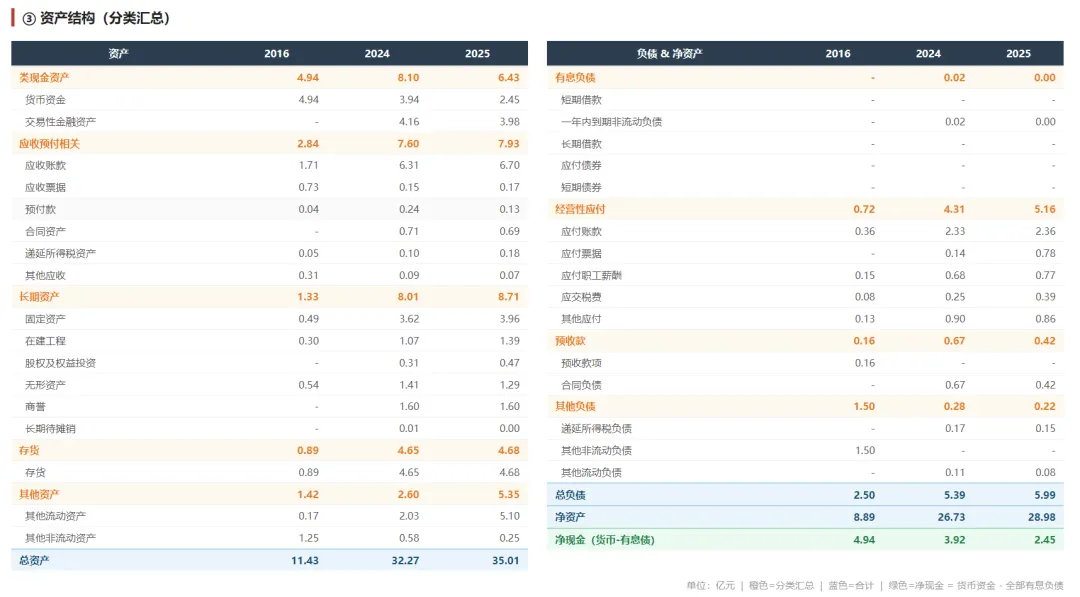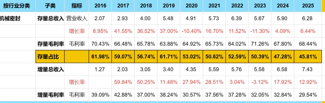 公司的资产负债表很干净,几乎无负债,存货,应收账款都没有啥大变化。类现金有6.5+5亿,其中有一块在其他流动资产里有5亿,一下增加了3亿(现金减少了2.7亿),公司把这么多钱放着做现金理财也很神奇,是随时要花么?其他资产没有啥好看的,贴一张图,愿意看的可以在电脑上打开看。所以,我们重点分析一下为啥公司的毛利率持续在掉,先说结论,公司为了拿更多的增量业务,这几年很拼,一直在拼价格抢占终端,前面我们说过机械密封这个生意,一旦装上了,后面就是绑定了客户,然后挣维护和替换的钱,这个就是所谓的存量业务,毛利率能到接近70%。所以公司降低毛利率抢市场,未来挣维护的钱,这个逻辑怎么听着都是时间的朋友。其他原因还有公司收购的那个德国公司KS GmbH 的业务拉低了毛利率,这个听听就行,不是主因。下表是我做的公司产品结构,可以看出来公司这几年的增量业务占比一直上升,存量占比在下降。按照公司披露的四分之一的增量业务能转化为存量业务,而且增长的不错,这个样子发展下去,未来的业绩不会太差。这个公司在低估的情况下买一点点以增加投资乐趣,因为公司比较稳,有护城河,出现极度低估情况也恰好有现金,可以考虑买入,但是不会长期(5-10年)持有。