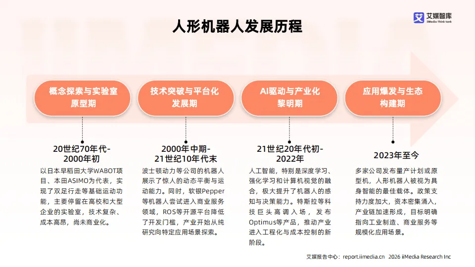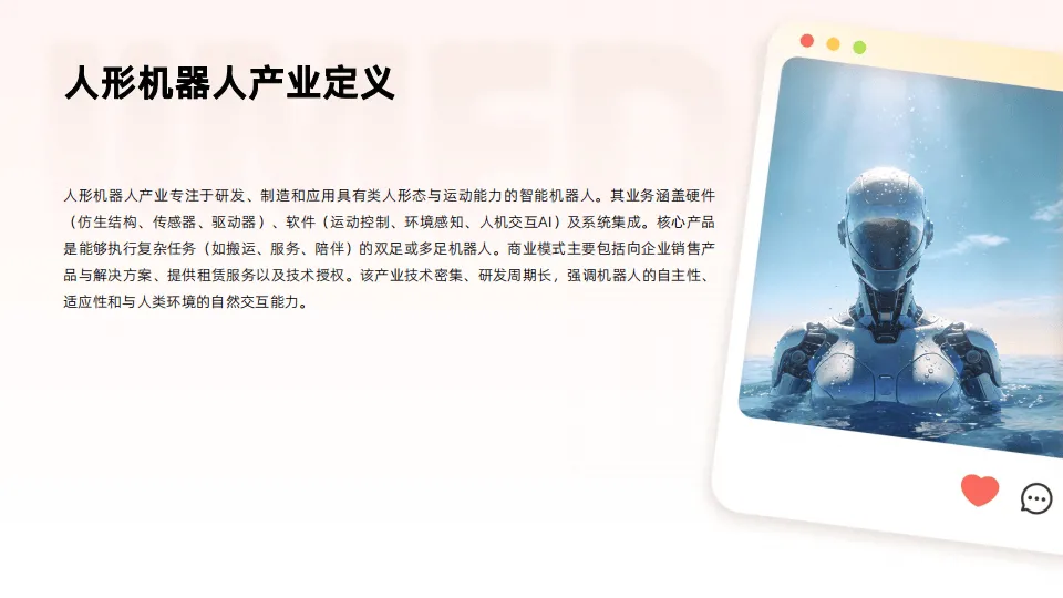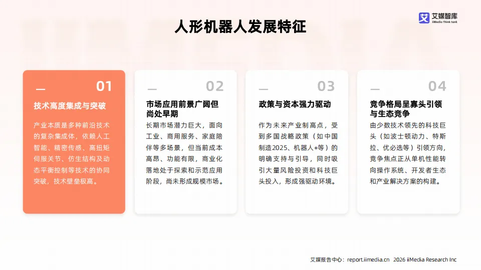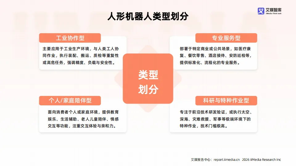 2025年中国人形机器人产业处于技术加速突破与商业化探索并行的阶段,作为技术高度集成的前沿领域,产业依托人工智能、精密传感、仿生结构等技术协同发展,呈现政策与资本双驱动、头部企业引领的格局。产业划分为工业协作、专业服务、家庭陪伴、科研特种四大类型,应用场景持续拓展,但整体仍未进入规模化落地期,以示范应用与技术验证为主。