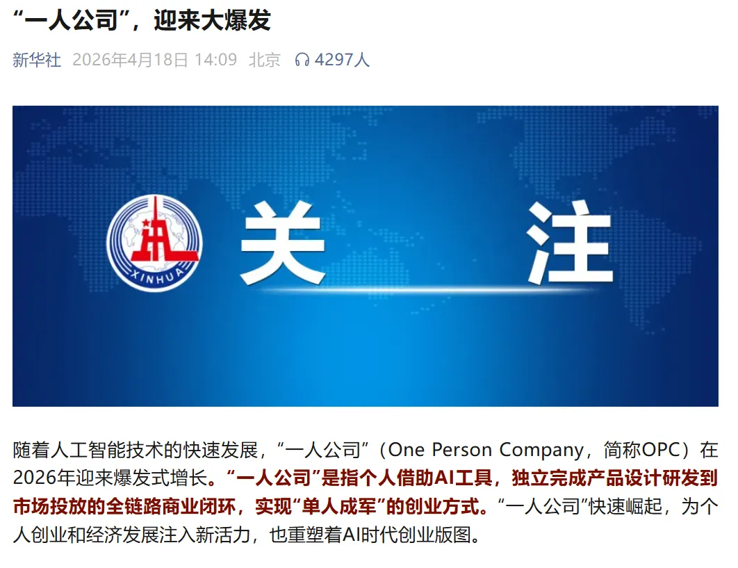 新华社的文章最后有一句话值得划重点:“一人公司”与新质生产力发展方向高度契合,未来有望成为推动经济高质量发展的重要力量。