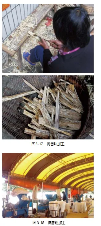 沉香现代炮制方法多沿袭古代炮制法。《中药炮制经验集成》中记载沉香炮制方法有劈碎、浸镑和蒸镑。《药典(2020年版)》记载沉香炮制方法为除去枯废白木,劈成小块,用时捣碎或研成细粉。地方炮制规范中,沉香炮制方法多是取原药材,除去枯废白木,劈成小块,用时研粉即得(图3-17)。