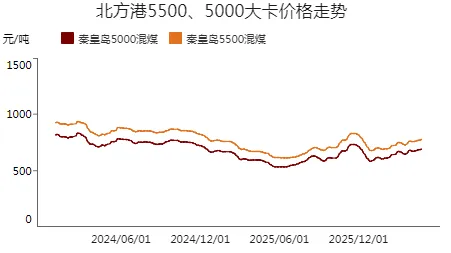 本周主产区煤价震荡运行。多数煤矿维持正常生产,个别因倒工作面或设备检修而停产减产,整体供应稳定。下游冶金、化工等终端维持刚需采购,部分站台大户发运稳定,带动多数煤矿产销平衡、价格持稳;部分高性价比煤矿价格探涨,少数出货不畅的煤矿则价格小幅回调。本周港口市场情绪整体偏强。受华南地区降雨影响,新能源出力不佳,火电厂耗煤量增加,终端补货较为积极,部分终端已将库存补充至六月份水平;除华南外,其余区域补库节奏依然偏缓。市场持续挺价,部分投机者对旺季预期较强,进行投机性采购,部分上游基于成本及对后市的乐观预期,惜售情绪渐生。尽管整体成交有限,但价格重心持续上移。预计短期市场将延续涨势,价格易涨难跌。