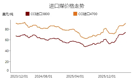 截至2026年4月24日,秦皇岛港5500价格报780.0元/吨,周环比增加8元/吨,秦皇岛港5000价格报694.0元/吨,周环比增加6.0元/吨。进口4700指数报90.5美元/吨,周环比增加1.2美元/吨,进口3800指数报73.8美元/吨,周环比增加0.8美元/吨。