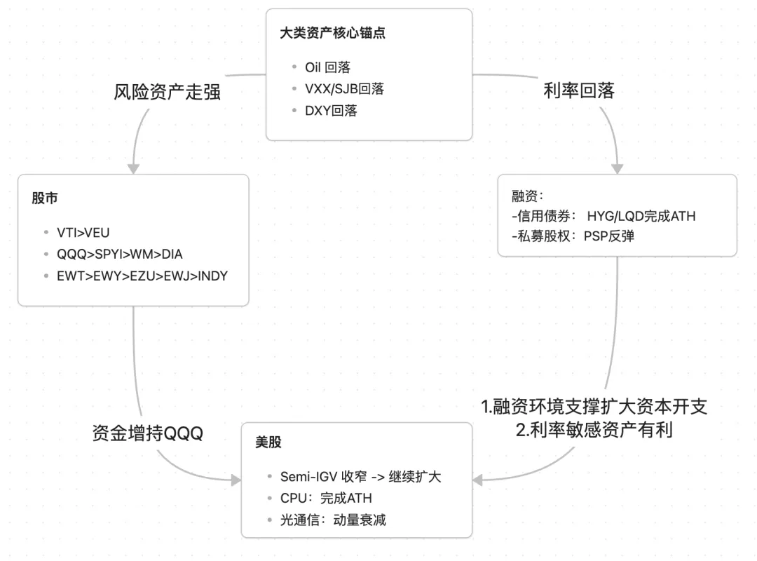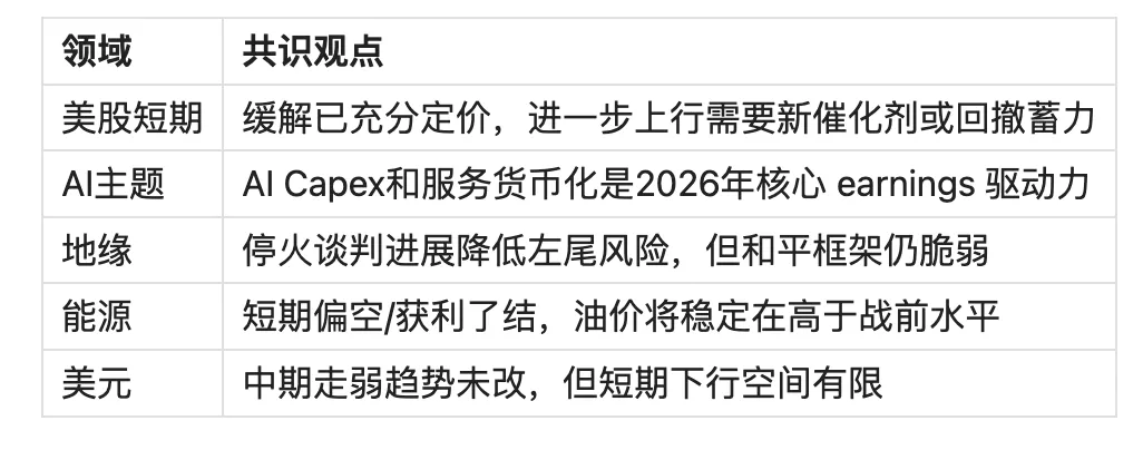 市场宽度走弱:虽然SPX和NDX创出历史新高,但冲突以来仅26%的S&P 500成分股跑赢指数(战前为68%),而AI相关股票中74%跑赢。 与上一条形成鲜明对比的是,距GS统计,尽管本季度财报季刚开始,但值得注意的是,已有58%的公司公布的业绩超出共识预期>1标准差(历史平均为49%)。另一方面,仅有4%的公司未达共识预期>1标准差(历史平均为13%,且显著低于迄今为止的历届财报季)。提醒一下,本财报季的预期门槛相当高,标普500本季度的共识预期为同比每股收益增长12%,这是自2021年以来财报季初的最高预期。 市场分化下,似乎美股的调整虽然可能来临。但当前宏观层面(图3)和科技中观产业趋势已形成高度共识。即使短期调整,难掩长期向上趋势。