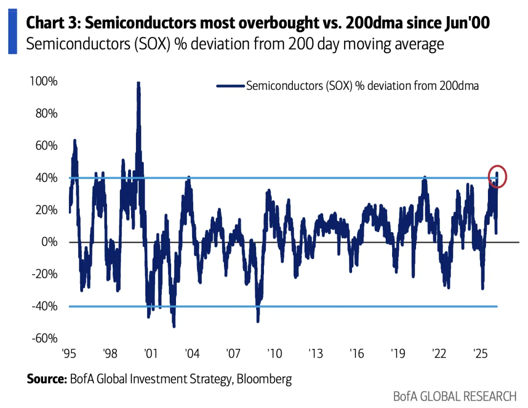 QQQ一枝独秀= 美股强于非美(VTI>VEU)= 美元反弹(图1)。亚洲股市资金流整体偏流出,继续验证之前的判断:全球交易新的齿轮开始转动 INTC和TXN业绩超预期带动CPU和模拟半导体板块高歌猛进,科技硬件已不局限于存储和光通信,形成了全面扩散。半导体指数(SOX)偏离200日均线程度创2000年6月以来最高。(图2) 软件依然偏软,下周极为关键:本周IGV失去反弹动量,下周为TMT财报高峰期,且MAG财报尤为关键:谷歌、微软、亚马逊、Meta周三发布财报,苹果周四收盘后分布。 一个简单的简论:财报支撑下软件如果重拾上涨动量,科技飞轮将会加速(上上周市场风格)。否则美股科技软硬件同时进入价格调整,随时可能发生。