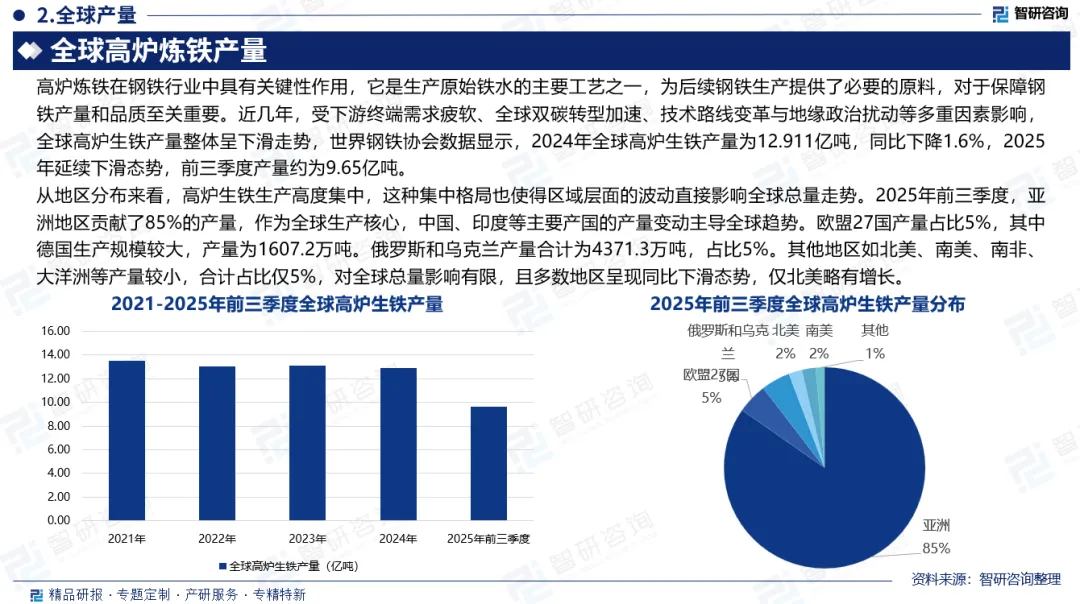 高炉炼铁产业链上游包括原材料及设备,原材料涉及铁矿石、燃料焦炭、石灰石等,设备主要包括高炉本体及供料设备、送风设备、喷吹设备、煤气处理设备、渣铁处理设备等其他辅助设备。中游为高炉炼铁,炼铁方法主要有高炉法、直接还原法、熔融还原法等,高炉炼铁是现代炼铁的主要方法,是钢铁生产中的重要环节。下游应用领域为转炉铁钢及铸件制造。高炉炼铁在钢铁行业中具有关键性作用,它是生产原始铁水的主要工艺之一,为后续钢铁生产提供了必要的原料,对于保障钢铁产量和品质至关重要。近几年,受下游终端需求疲软、全球双碳转型加速、技术路线变革与地缘政治扰动等多重因素影响,全球高炉生铁产量整体呈下滑走势,世界钢铁协会数据显示,2024年全球高炉生铁产量为12.911亿吨,同比下降1.6%,2025年延续下滑态势,前三季度产量约为9.65亿吨。从地区分布来看,高炉生铁生产高度集中,这种集中格局也使得区域层面的波动直接影响全球总量走势。