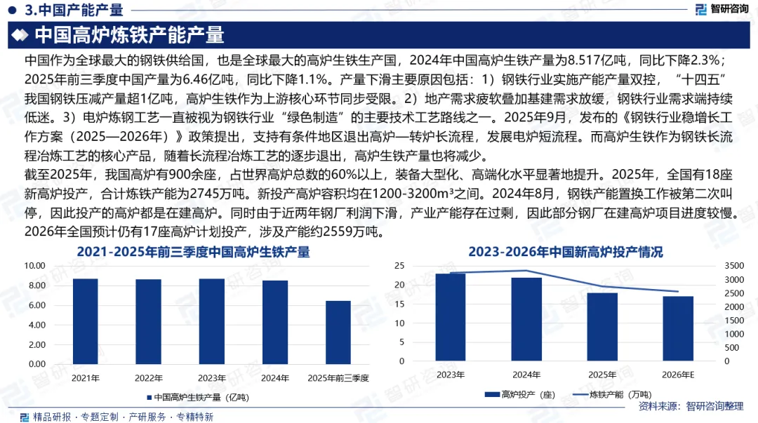 中国产量:中国作为全球最大的钢铁供给国,也是全球最大的高炉生铁生产国,2024年中国高炉生铁产量为8.517亿吨,同比下降2.3%;2025年前三季度中国产量为6.46亿吨,同比下降1.1%。产量下滑主要原因包括:钢铁行业实施产能产量双控、钢铁行业需求端持续低迷、国家鼓励发展电炉短流程炼钢等。