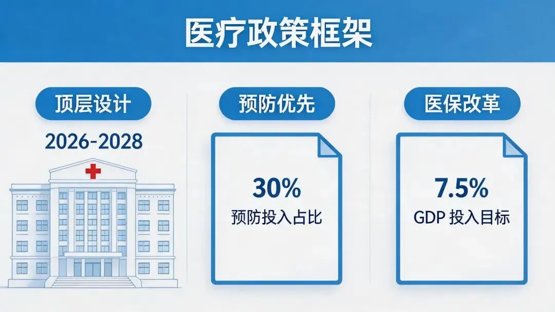 国家发改委与国家卫健委联合发布的《健康产业高质量发展三年行动计划(2026-2028)》正式落地, 2028 年健康产业增加值占 GDP 比重提升至 7.5% 的目标。
