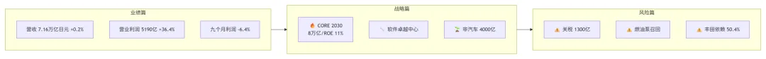 业绩增长与利润承压并存:2025财年全年营收7.16万亿日元,营业利润5,200亿日元(同比+36.5%);但前三财季营业利润3,759亿日元(同比-6.4%),归属母公司净利润同比下滑12.5%,反映下半年利润压力在汇率利好下有所缓解,但外部压力依然显著。
