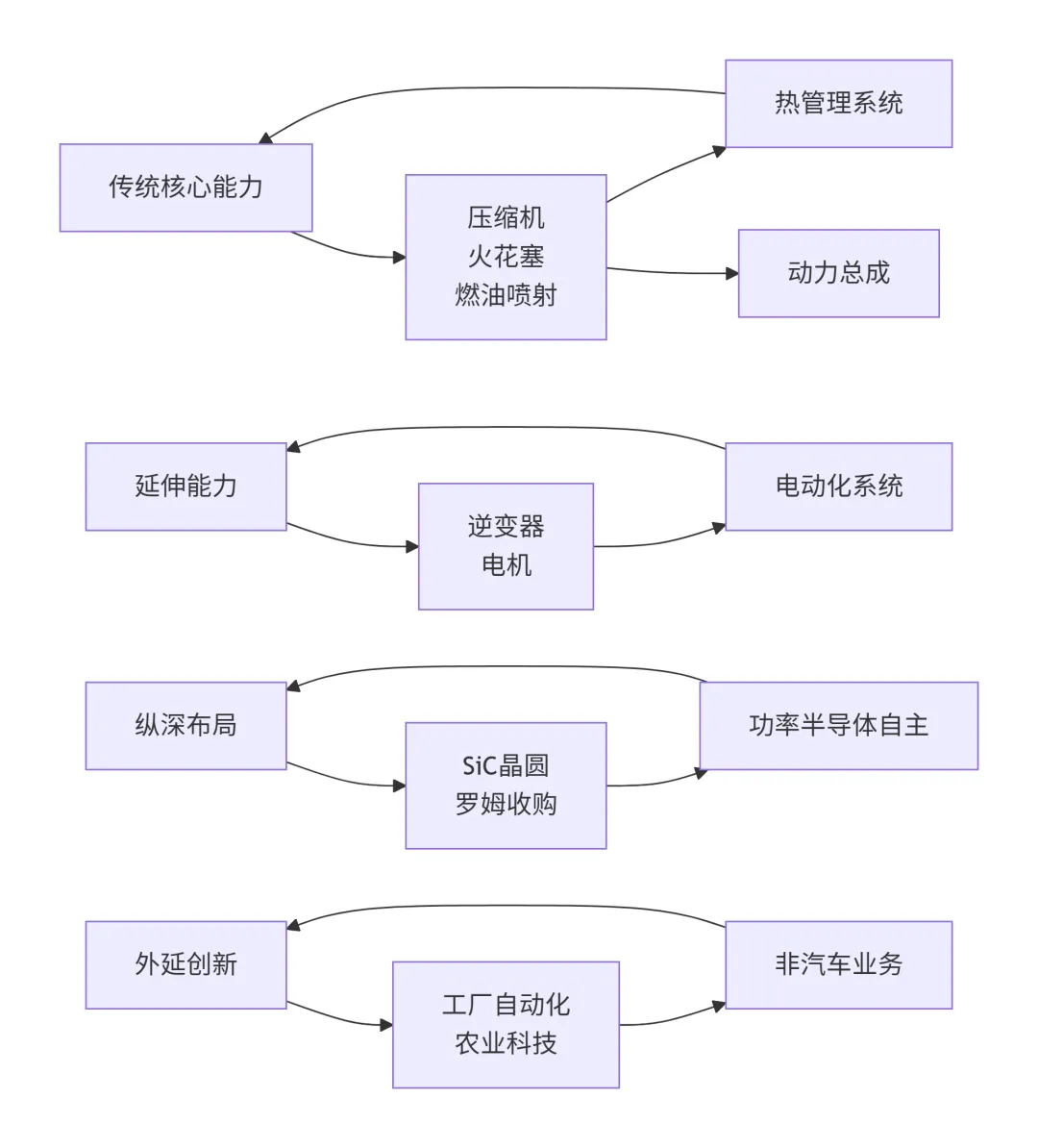 核心能力:电装最难以模仿的独特能力在于“精密热管理+电力控制+高可靠性制造”三位一体的系统集成能力——从压缩机、逆变器、电机的零部件级到整车热管理系统级的全栈技术覆盖。这一能力在电动化时代价值进一步放大:电动车对热管理的需求复杂度较燃油车提升3-5倍,电装的技术积累形成天然竞争壁垒。