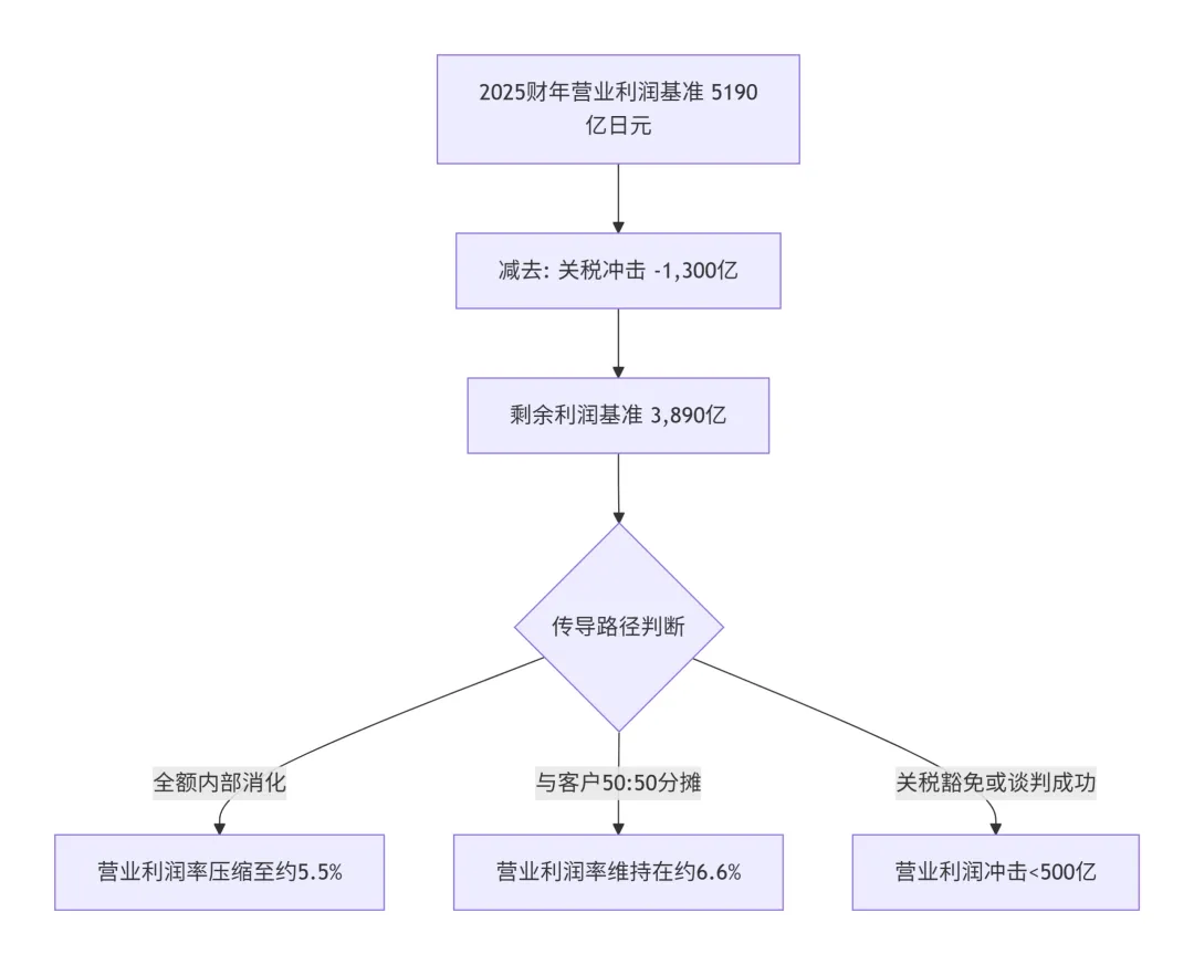 关税政策冲击:美国对进口汽车及零部件加征25%关税,电装2026财年面临约1,300亿日元的关税相关成本。若完全内部消化→营业利润率压缩约1.8-2.0pp;若50%向整车厂传导→利润率影响约0.9-1.0pp。