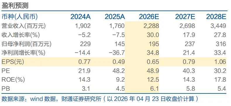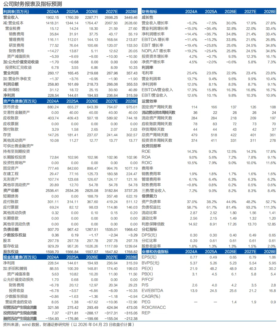 事件:公司2026年4月23日发布2025年财报和2026年一季报:2025年公司收入17.60亿元,同比-7.5%;毛利率23.65%,同比-1.8pct;归母净利润1.45亿元,同比-36.7%。2026年一季度收入4.73亿元,同比+12.6%;毛利率20.97%,同比-3.8pct;归母净利润0.36亿元,同比-10.0%。