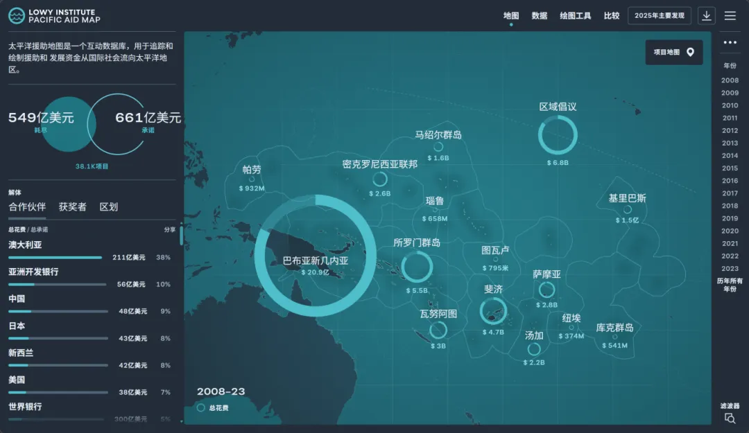 洛伊研究所(Lowy Institute)的路径则更能体现数字平台的另一种优势——不是靠“说”,而是靠“做成工具”。它的《太平洋辅助地图》(Pacific Aid Map)并不只是一个静态数据库,而是把援助信息、项目流向、资金规模及地区分布做成可交互、可查询、可视化的平台。这样一来,智库影响政策的方式就不再只是发布判断,而是通过提供可直接使用的数据基础设施,服务研究者、媒体、政策官员和国际机构。换句话说,洛伊研究所影响决策,不只是靠观点,而是靠把研究能力转化成一个大家离不开的公共工具。谁掌握了稳定、可信、便于使用的数据平台,谁就更容易在相关议题的政策讨论中占据主动。