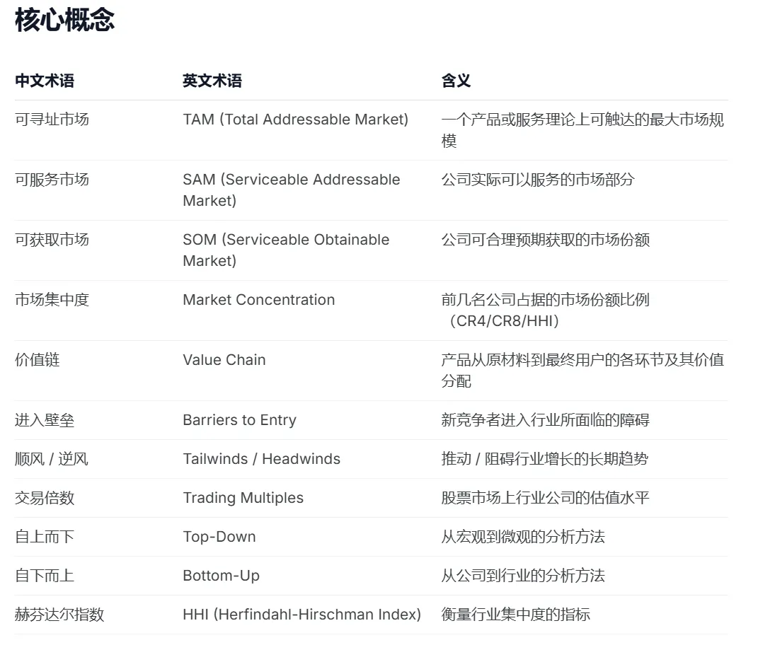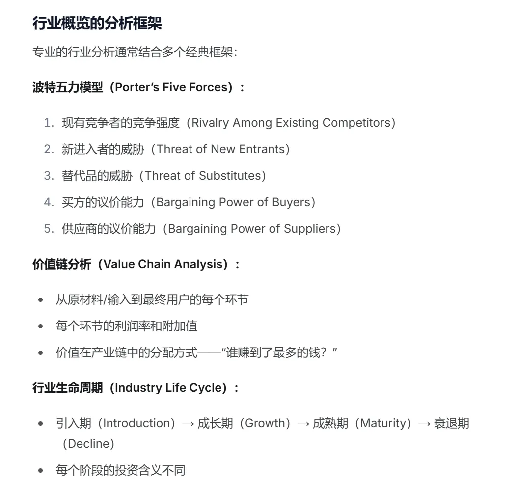 • 这个市场有多大?未来增长空间在哪里? • 行业内谁在赚钱?利润集中在哪些环节? • 竞争是如何发生的?谁在获取份额? • 有没有新的技术或商业模式正在改变行业? • 当前估值是否合理?