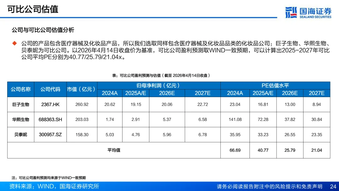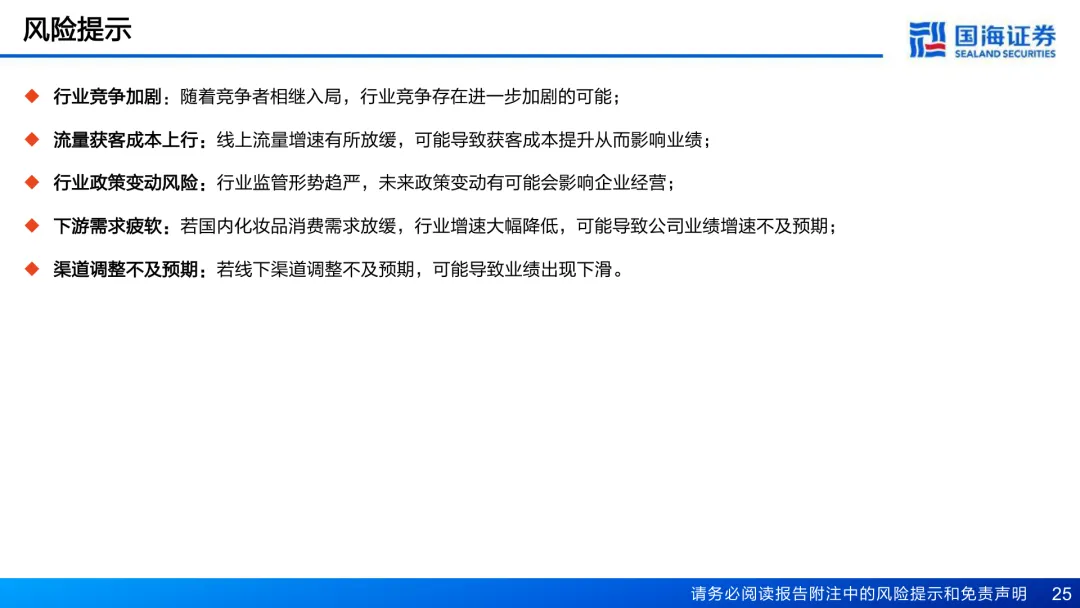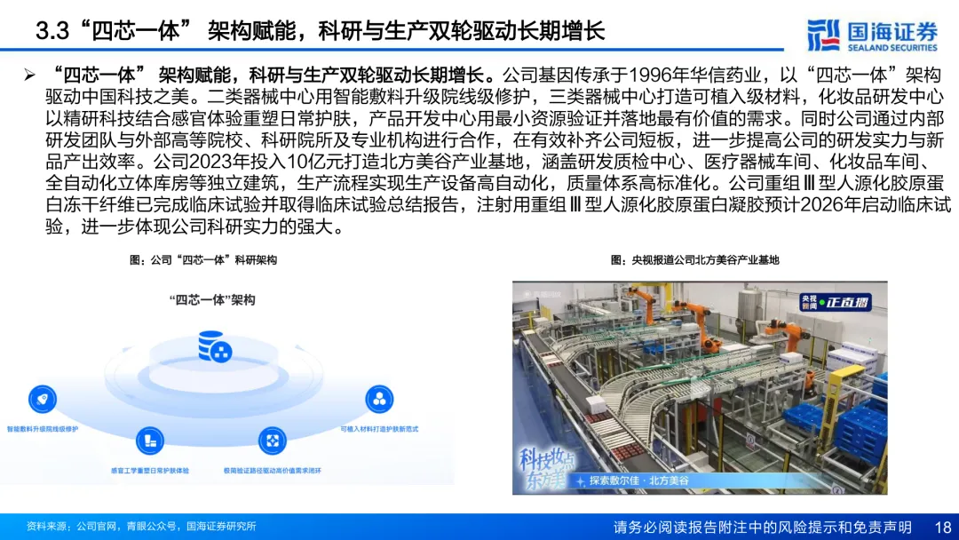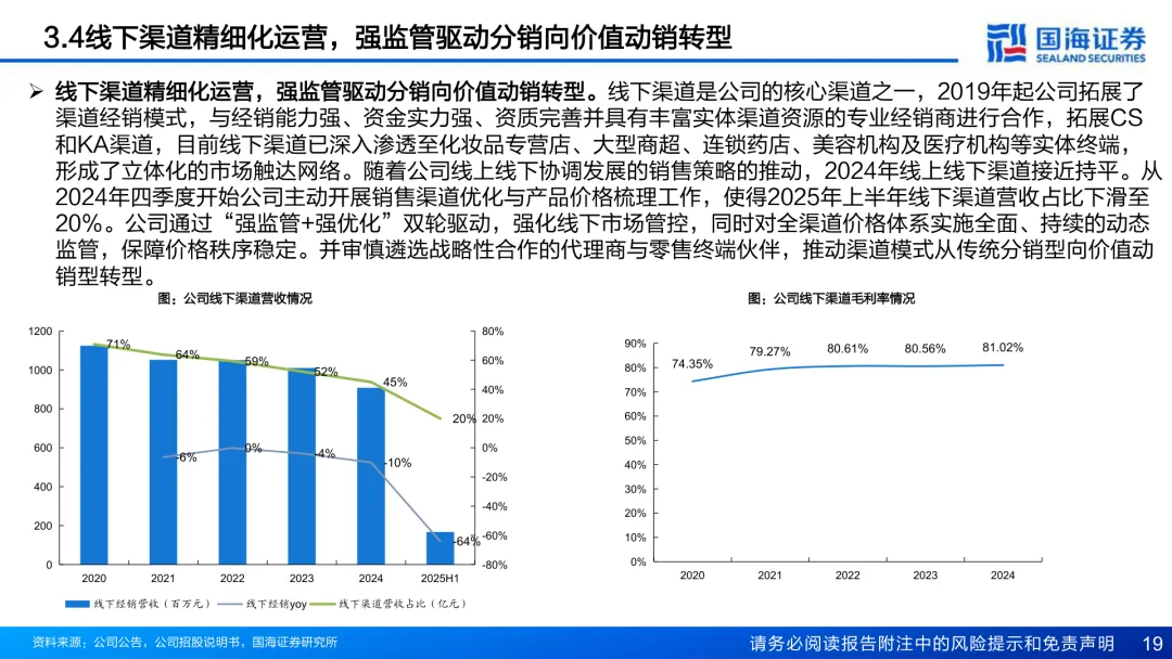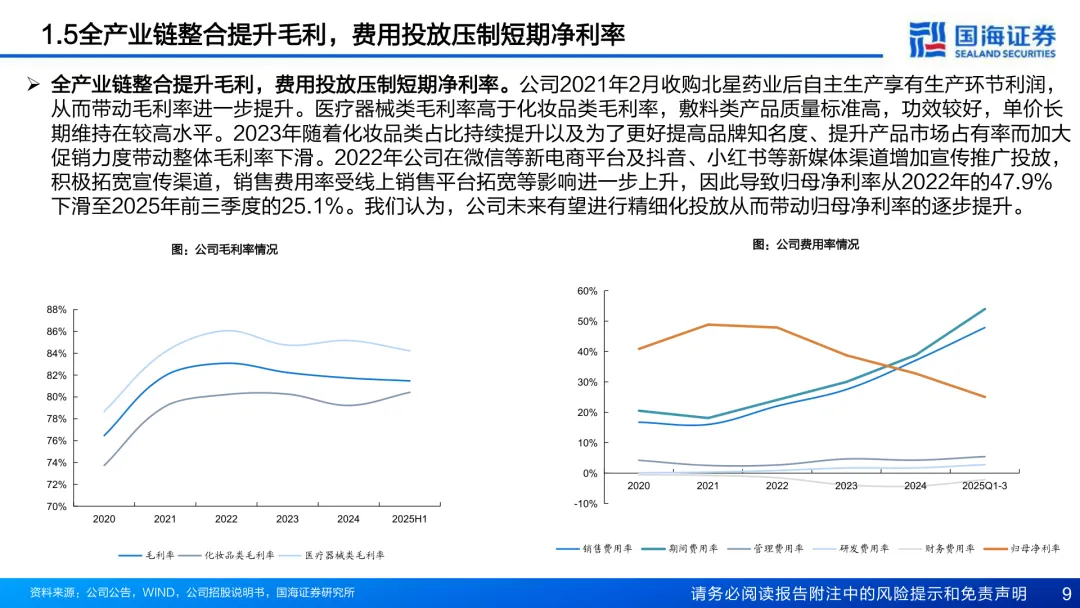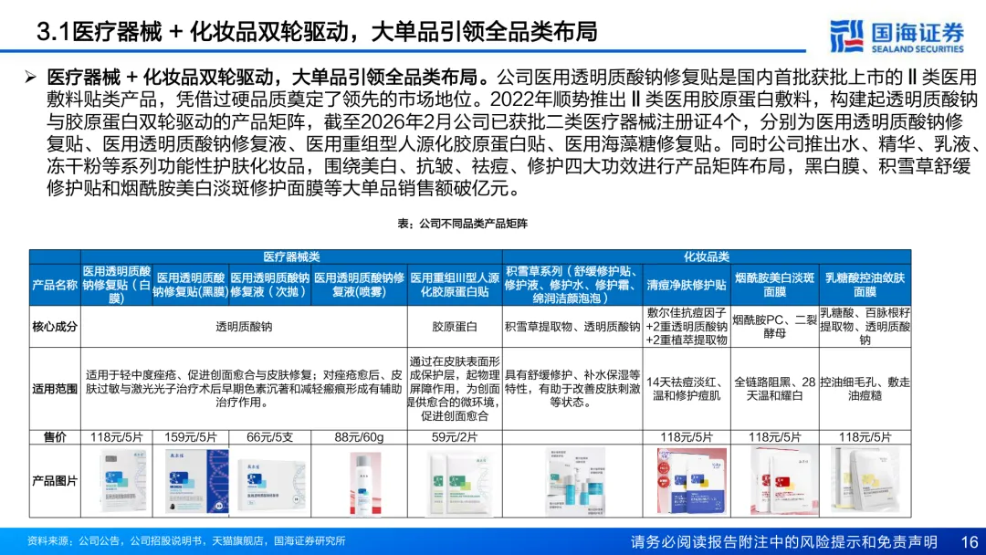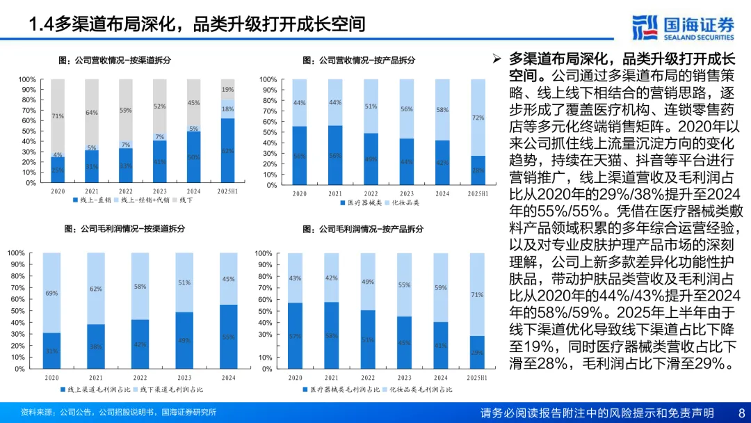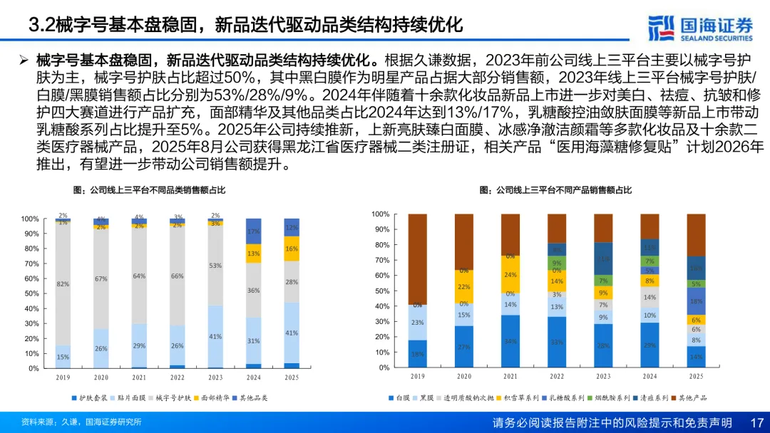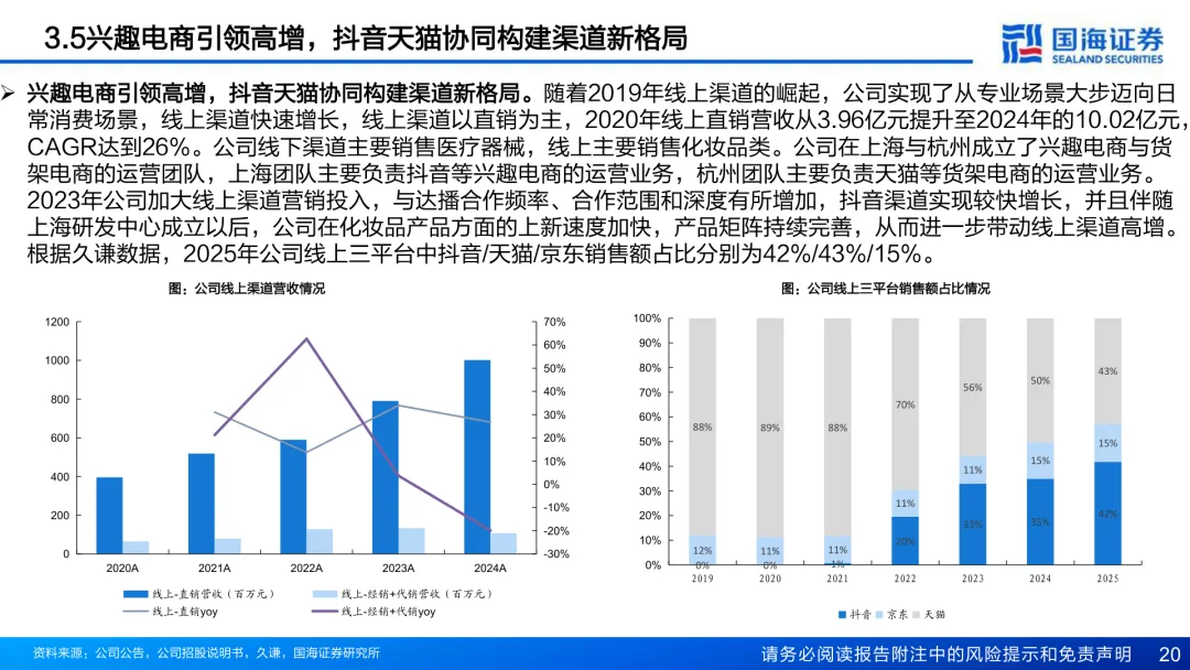 双轮驱动完善产品矩阵,线下渠道优化线上渠道持续高增。公司医疗器械构建起透明质酸钠与胶原蛋白双轮驱动的产品矩阵,同时推出水、精华、乳液、冻干粉等系列功能性护肤化妆品。公司械字号基本盘稳固,2024年伴随着十余款化妆品新品上市进一步对美白、祛痘、抗皱和修护四大赛道进行产品扩充,从而带动化妆品类占比持续提升。同时公司重组Ⅲ型人源化胶原蛋白冻干纤维已完成临床试验并取得临床试验总结报告,注射用重组Ⅲ型人源化胶原蛋白凝胶预计2026年启动临床试验,进一步体现公司科研实力的强大。线下渠道精细化运营,从2024年四季度开始公司主动开展销售渠道优化与产品价格梳理工作,推动渠道模式从传统分销型向价值动销型转型。2019年线上渠道崛起助力公司实现从专业场景大步迈向日常消费场景,未来产品矩阵持续完善,从而进一步带动线上渠道高增。根据久谦数据,2025年公司线上三平台中抖音/天猫/京东销售额占比分别为42%/43%/15%。