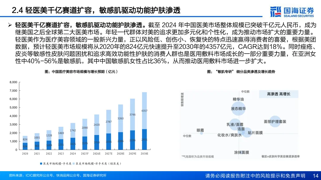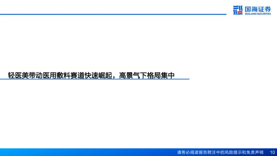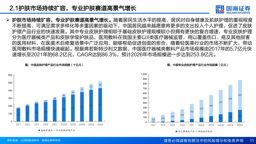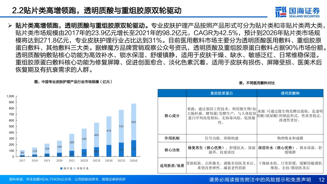 轻医美带动医用敷料赛道快速崛起,高景气下格局集中。随着轻医美行业的市场不断扩大,带动医用敷料市场规模快速崛起,根据弗若斯特沙利文数据,医疗器械类敷料产品市场规模由2017年的5.7亿元快速增长至2021年的68.2亿元,CAGR达到86.3%。据蝉魔方品牌营销观察公众号资讯,透明质酸及重组胶原蛋白敷料占据90%市场份额,皮肤屏障修护医用敷料作为II类医疗器械,市场集中度较高。