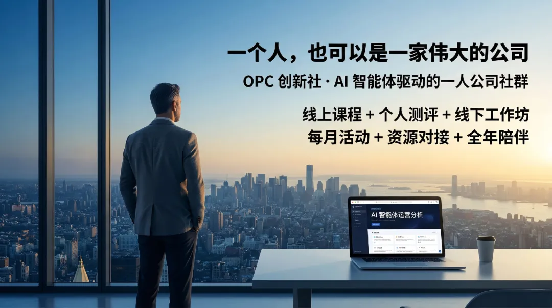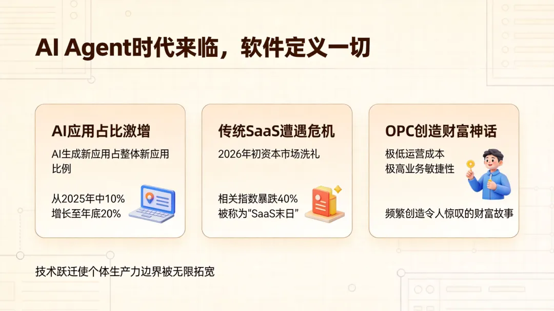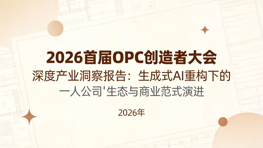 商业组织的历史,本质上是一部关于交易成本与协同效率的演进史。自工业革命以来,由于信息不对称与专业壁垒的存在,庞大的科层制企业始终是资源配置的最优载体。然而,随着2024年至2026年间生成式人工智能和大语言模型的跨越式发展,这一支撑了现代商业数百年的底层逻辑正在被彻底解构。2026首届OPC(One Person Company,一人公司)创造者大会的召开,标志着一种全新的商业单元正式登上历史舞台。人工智能在此刻已全面跨越了“辅助工具”的范畴,演变为具备自主规划、决策与执行能力的“智能体(AI Agent)”。这种技术跃迁使得个体劳动者的生产力边界被无限拓宽,超级个体与大型平台之间的博弈进入了全新的纪元。