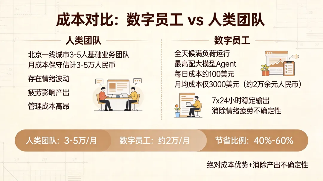通过这种机制,ezcloud支持OPC在单一软件平台上“雇佣”多个虚拟员工(子Agent),并赋予它们不同的职能部门角色。这些数字员工不仅可以7x24小时全天候运行,还能通过系统内部的“交换文档”或“模拟发送邮件”方式实现Agent-to-Agent的独立信息互通,从而让“一人公司”真正具备了组织级的矩阵式运转能力。从成本核算来看,在北京等一线城市雇佣一个3-5人的基础业务团队,月成本保守估计在3万至5万元人民币;而全天候满负荷运行最高配的大模型Agent,每日成本约为100美元,月均成本仅为3000美元(约合2万余元人民币),不仅显现出绝对的成本优势,更彻底消除了人类员工由于情绪、疲劳带来的产出不确定性。