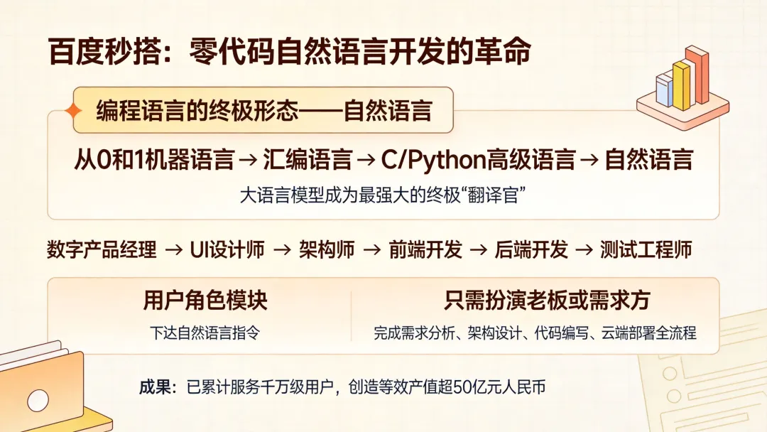 AI大模型的进化使得编程语言的演进逼近其理论上的终极形态——自然语言。百度秒搭产品总经理朱广祥详细阐述了这一技术哲学:从0和1的机器语言,到汇编语言,再到C/Python等高级语言,每一次演进都伴随着编译器的升级与人类表达意图的简化。如今,大语言模型成为了最强大的终极“翻译官”,直接将人类的自然语言转化为可执行的系统代码。