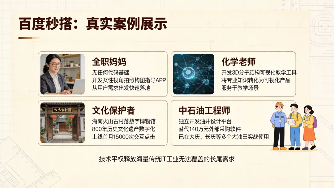 这种技术平权释放了海量传统IT工业无法覆盖的长尾需求。在大会展示的案例中,一位全职妈妈在没有任何代码基础的情况下,开发了一款基于女性视角的拍照构图指导APP;海南一位文化保护者,通过简单的对话指令,构建了一座拥有800年历史的火山古村落数字博物馆,上线仅一个月便突破了15000次交互点击;一名化学老师开发了3D分子结构可视化教学工具;而中石油的一位一线工程师,更是利用秒搭平台独立开发了一套油井设计平台,成功替代了企业原计划耗资140万元采购的外部软件,并已在大庆、长庆等多个大油田投入实战使用。据统计,百度秒搭已累计服务千万级用户,其生成的应用若按传统人力开发成本核算,创造的等效产值已超过50亿元人民币。