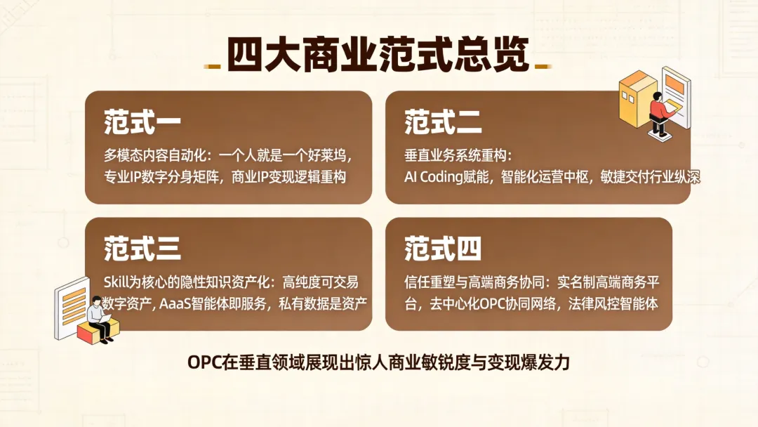 有了前所未有的强大底层基础设施作为弹药库,OPC创造者们在各个垂直领域展现出了惊人的商业敏锐度与变现爆发力。大会的“闪电秀”环节深度揭示了当前OPC变现的核心范式,这些范式不仅在效率上替代了传统劳动力,更创造了全新的商业供给模式。