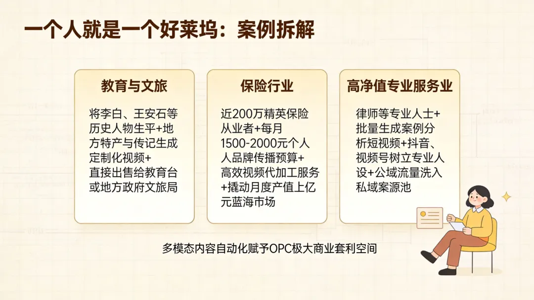 基于字节跳动的Seedance 2.0视觉模型以及阿里云即将推出的“快乐马”,创作者彻底摆脱了对传统导演、编剧和摄影团队的依赖。高质量的口播或漫剧视频生成成本已被极致压缩至数十元人民币级别。这种技术降维赋予了OPC极大的商业套利空间。周宇展示了三种截然不同的垂直行业定制变现路径:其一,在教育与文旅领域,OPC可以将李白、王安石的生平或地方特产与历史传记生成定制化视频,直接出售给各地教育台或地方政府文旅局;其二,在保险行业,面对中国近200万精英保险从业者每月1500至2000元的个人品牌传播预算需求,OPC提供的高效视频代加工服务撬动了一个月度产值上亿元的蓝海市场;其三,在律师等高净值专业服务业,OPC通过批量生成案例分析短视频,帮助律师在抖音、视频号等平台树立专业人设,将公域流量精准洗入私域案源池,极大地提升了民事诉讼的获客效率。