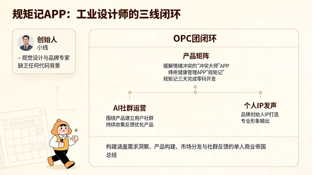 规矩记APP的创始人小线(视觉设计与品牌专家)同样印证了这一OPC闭环的威力。作为缺乏任何代码背景的工业设计师,她仅用三天时间便通过AI零码开发出提醒按时吃饭的应用、缓解情绪冲突的“冲突大师”APP,以及针对久坐人群的痔疮健康管理APP“规矩记”。依托这三条相互独立却又相互反哺的业务线(产品矩阵、AI社群运营与个人IP发声),她成功构建了一个涵盖需求洞察、产品构建、市场分发与社群反馈的单人商业帝国。
