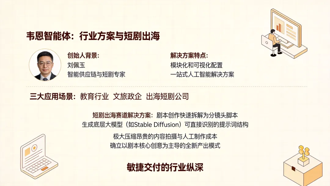 韦恩智能体创始人刘佩玉(智能供应链与短剧专家)进一步分享了这种敏捷交付的行业纵深。通过模块化和可视化配置,她为教育行业、文旅政企以及出海短剧公司提供了一站式的人工智能解决方案。在短剧出海(TikTok等平台)赛道,她的智能体平台能够将核心的“剧本创作”快速拆解为分镜头脚本,并生成底层大模型(如Stable Diffusion)可直接识别的提示词结构,极大地压缩了昂贵的内容拍摄与人工制作成本,确立了以剧本核心创意为主导的全新产出模式。