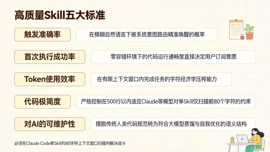 手工川将当前的Skill商业化比作早期金融市场中贩卖股票交易指标(解决用户何时买、何时卖的决策痛点)。在即将出版的《Agent Skill高质量设计指南》中,他提出了衡量高质量Skill的五大严苛标准:触发准确率(能否在海量意图下被精准唤醒)、首次执行成功率(决定了商业交付的用户体验)、Token使用效率(对运行成本的压榨控制)、对AI的理解难度(可维护性)以及极简的代码体量(Claude Code单Skill仅限约80个字符的上下文窗口扫描,必须在500行代码内解决战斗)。