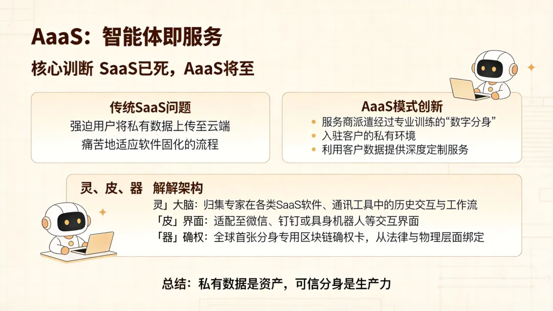 智产派(校友府智能)创始人鲍晓东则将这一概念推向了企业级服务的高度。他提出了一个震撼业界的论断:“SaaS已死,AaaS(Agent as a Service,智能体即服务)将至”。传统SaaS的本质是强迫用户将私有数据上传至云端,并痛苦地适应软件固化的流程。而在AaaS模式下,服务商将派遣经过专业训练的“数字分身”入驻客户的私有环境,利用客户的数据提供深度定制服务。