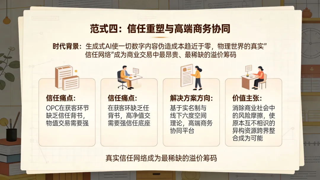 Nexus创始人王绍旭通过构建基于实名制与线下六度空间理论的高端商务协同平台,直击OPC在获客与高净值交易环节的信任痛点。在Nexus平台上(如针对IBM 15万校友的专属空间),由真实线下关系背书的用户数字分身代替人类,进行24小时的商务对接、资源匹配与商机摘要。这种强信任底座有效消除了商业社会中的风险摩擦,使得原本互不相识的异构资源(如软件开发OPC与硬件电路设计OPC)的跨界整合成为可能。
