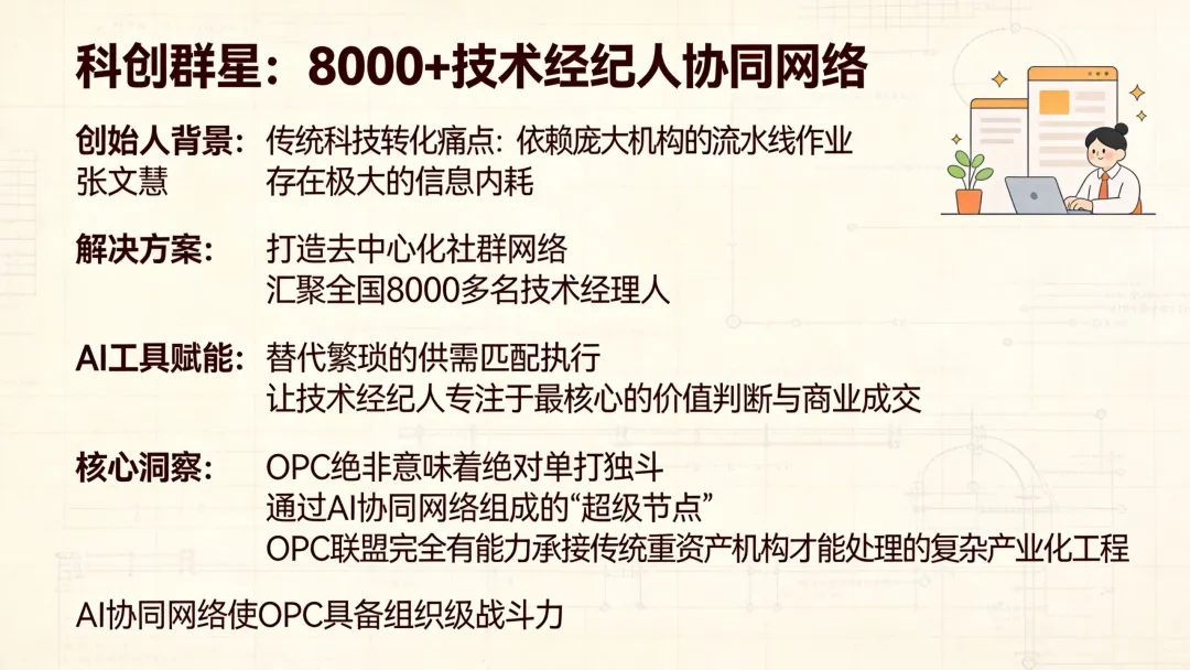 科创群星创始人张文慧则在科技成果转化这一高度依赖个人复合经验的非标领域,展现了OPC协同网络的威力。传统的科技转化依赖庞大机构的流水线作业,存在极大的信息内耗。通过打造一个汇聚全国8000多名技术经理人的去中心化社群网络,张文慧利用AI工具替代了繁琐的供需匹配执行,让技术经纪人专注于最核心的价值判断与商业成交。这表明,OPC绝非意味着绝对的单打独斗;通过AI协同网络组成的“超级节点”,OPC联盟完全有能力承接传统重资产机构才能处理的复杂产业化工程。