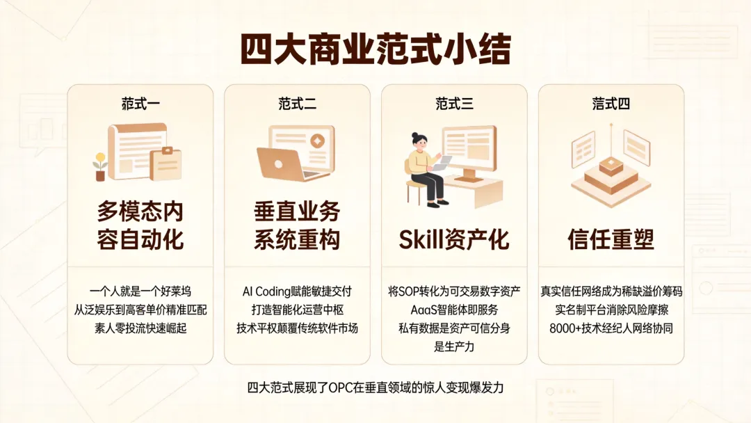 这些现象揭示了一个深远的商业本质:AI彻底打破了劳动力投入、资本规模与无边际分发产品之间的传统等式。当软件工程、内容生产、商务协作与底层信任体系被算法重新编码,组织架构的“去中心化”与生产力的“极度个人化”成为了不可逆转的洪流。本报告将以本次大会的深度探讨为基石,从底层基础设施的演进、个体商业落地的多元范式、企业级应用的博弈、以及产学研创投生态等维度,全景剖析OPC赛道的深层商业逻辑与未来走向。