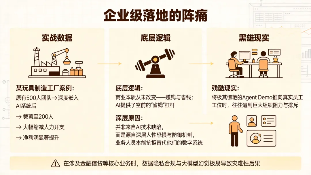 然而,在实际交付中,将极其惊艳的Agent Demo推向真实的员工工位时,往往遭到巨大的组织阻力与排斥。孙伟东指出,这种阻力并非来自AI的技术缺陷,而是源自深层的人性恐惧与防御机制——业务人员本能地抗拒那些表现优异、旨在替代他们的数字系统。更严峻的是,在涉及金融信贷等核心业务时,数据隐私合规与大模型固有的“幻觉”极易导致灾难性的后果。
