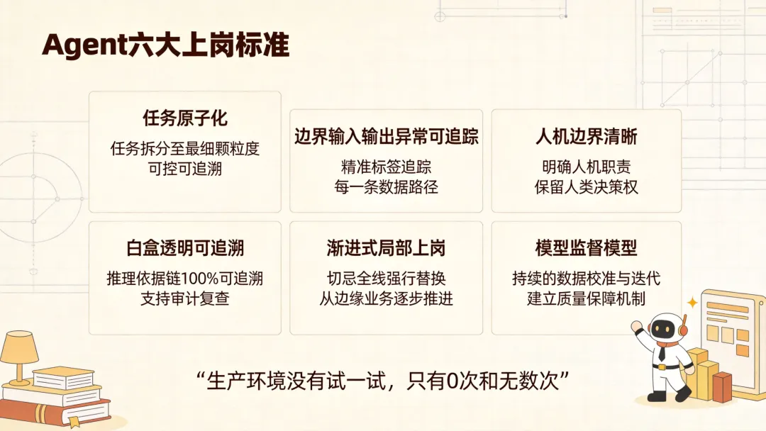 基于这“四把锁”,孙伟东进一步提出了能让传统老板放心买单的Agent“六大上岗标准”:任务原子化、边界输入输出异常可追踪、人机边界清晰、白盒透明可追溯、渐渐式局部上岗(切忌全线强行替换)、以及利用模型监督模型进行持续的数据校准与迭代。他一针见血地指出:“生产环境没有试一试,只有0次和无数次。”脱离了底层数据约束与人性管理的盲目智能化,最终只会沦为无人问津的数字落灰资产。
