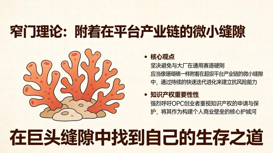 中国经营报副总编辑、商学院杂志主编曲丽丽则从商业洞察的角度,提出了“产品即市场”的融合观点。她认为在AI时代,由于开发成本趋近于零,基于特定用户群体痛点快速构建产品的过程,本身就是一次精准的市场验证。OPC必须践行“窄门理论”,坚决避免与大厂在通用赛道硬刚,而应当像珊瑚礁一样,附着在超级平台产业链的微小缝隙中,通过持续的快速迭代进化来建立抗风险能力。同时,她强烈呼吁OPC创业者重视知识产权的申请与保护,将其作为构建个人商业壁垒的核心护城河。