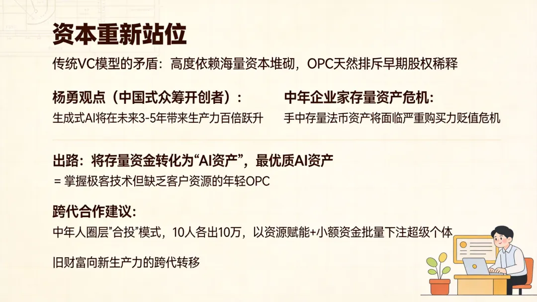 中国式众筹开创者、AI咖啡馆发起人杨勇给出了极具冲击力的社会经济学洞察。他犀利地指出,生成式AI将在未来3至5年内带来生产力的百倍跃升;这意味着,对于掌握了传统财富的中年企业家而言,他们手中的存量法币资产将面临严重的购买力贬值危机。面对这一关乎阶层存续的焦虑,唯一的出路是将存量资金转化为“AI资产”。而目前最优质的AI资产,正是那些掌握了极客技术却缺乏客户资源与行业人脉的年轻OPC创造者。杨勇大力倡导通过中年人圈层“合投”的模式(例如10人各出10万),以资源赋能加上小额资金,批量下注超级个体,完成旧财富向新生产力的跨代转移。
