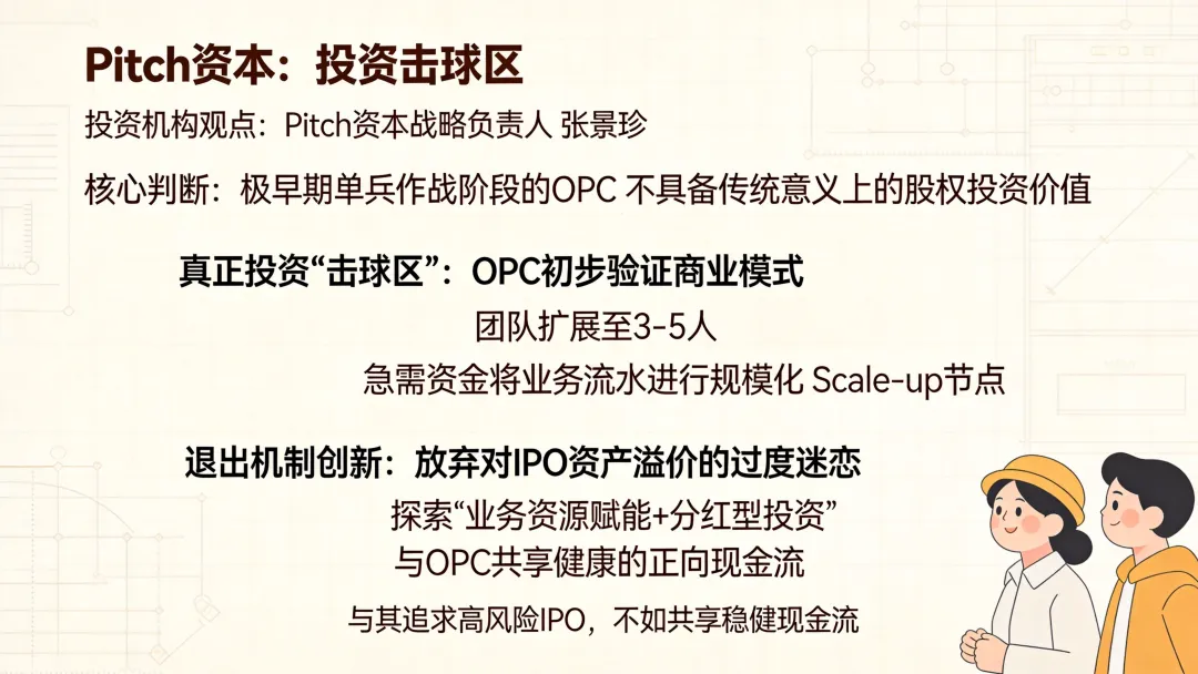 Pitch资本战略负责人张景珍则代表了新型投资机构的理性演进。她明确表示,极早期处于单兵作战阶段的OPC并不具备传统意义上的股权投资价值。真正的投资“击球区”,在于该OPC初步验证了商业模式,团队扩展至3-5人,急需资金将业务流水进行规模化的节点。在退出机制上,Pitch资本放弃了对IPO资产溢价的过度迷恋,转而探索“业务资源赋能+分红型投资”的新型资本合作模式,与OPC共享健康的正向现金流。