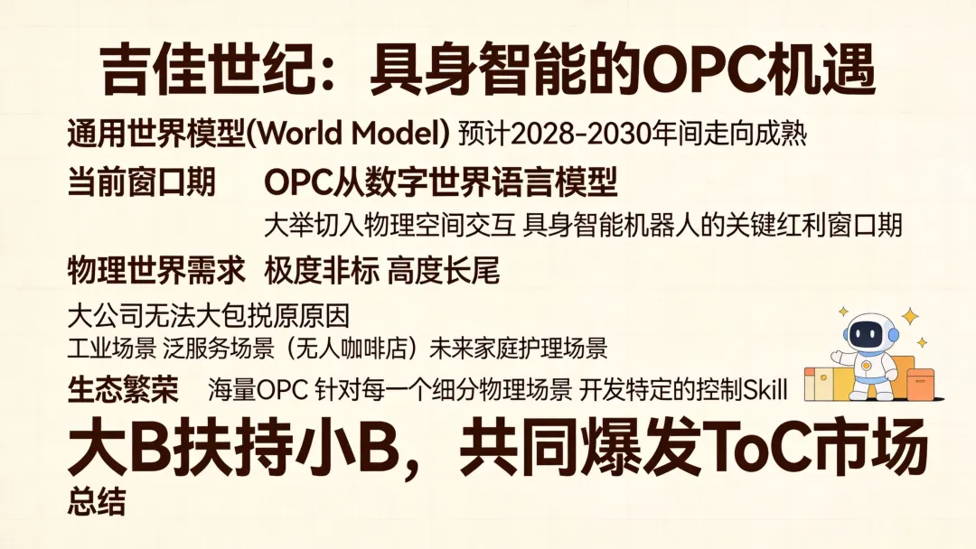 作为估值超百亿的具身智能独角兽企业代表,吉佳世纪首席科学家朱正则从底层技术的时间演进表给出了产业维度的判断。他预测,通用世界模型将在2028年至2030年间走向成熟,而当前正是OPC从数字世界的语言模型,大举切入物理空间交互(具身智能机器人)的关键红利窗口期。物理世界中的工业场景、泛服务场景(如无人咖啡店)以及未来的家庭护理场景,其需求呈现出极度非标和高度长尾的特征,这注定了大型科技公司无法大包大揽。生态的繁荣必须依赖海量OPC去针对每一个细分物理场景开发特定的控制Skill。为此,吉佳世纪不仅主动拥抱开发者,更推出了针对具身交互的Faceclaw开源框架与应用赛事,通过资金与算力的反哺,构建“大B(平台型底层模型)扶持小B(OPC应用开发者),共同爆发ToC市场”的宏大产业格局。