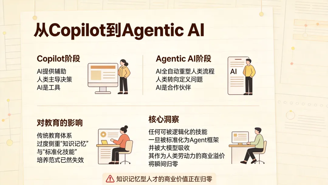 北京大学软件与微电子学院创始院长陈钟教授,从产学研的最高维度为本次大会画上了深邃的思想句号。他深刻指出,随着AI从提供Copilot辅助,无可挽回地演进为全自动重塑人类流程的Agentic AI,传统教育体系中过度侧重“知识记忆”与“标准化技能”的培养范式已然彻底失效。任何一项可被逻辑化的技能,一旦被标准化为Agent框架并被大模型吸收,其作为人类劳动力的商业溢价将会在瞬间归零。