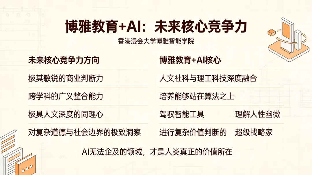 在这一不可逆的时代洪流中,香港浸会大学博雅智能学院所推崇的教育探索指明了人类自救的方向:未来的核心竞争力,将全面向AI无法企及的领域转移——即极其敏锐的商业判断力、跨学科的广义整合能力、极具人文深度的同理心,以及对复杂道德与社会边界的极致洞察。所谓“博雅教育+AI”,正是旨在通过人文社科与理工科技的深度融合,培养出能够站在算法之上,驾驭智能工具、理解人性幽微,并进行复杂价值判断的超级战略家。只有具备这种底层认知护城河的个体,才能在未来避免被无孔不入的算法工具反噬,真正成为能够定义系统问题、整合跨界资源的顶级OPC缔造者。