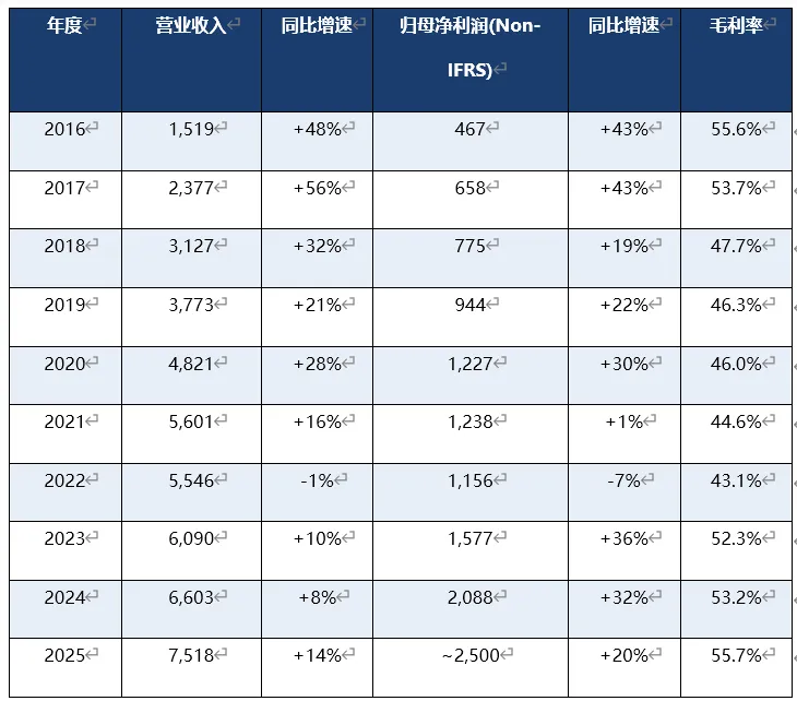营收增速呈「倒V型」走势:2017年峰值56%→2022年低谷-1%→2025年回升至14%,走出V型反转;
